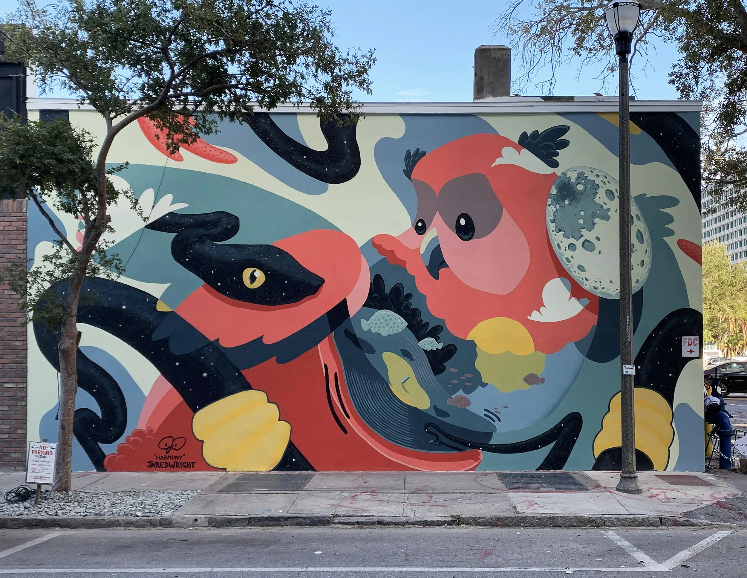 Colorful mural of an owl with a moon on its back, surrounded by abstract shapes, trees, and clouds, on an exterior wall.